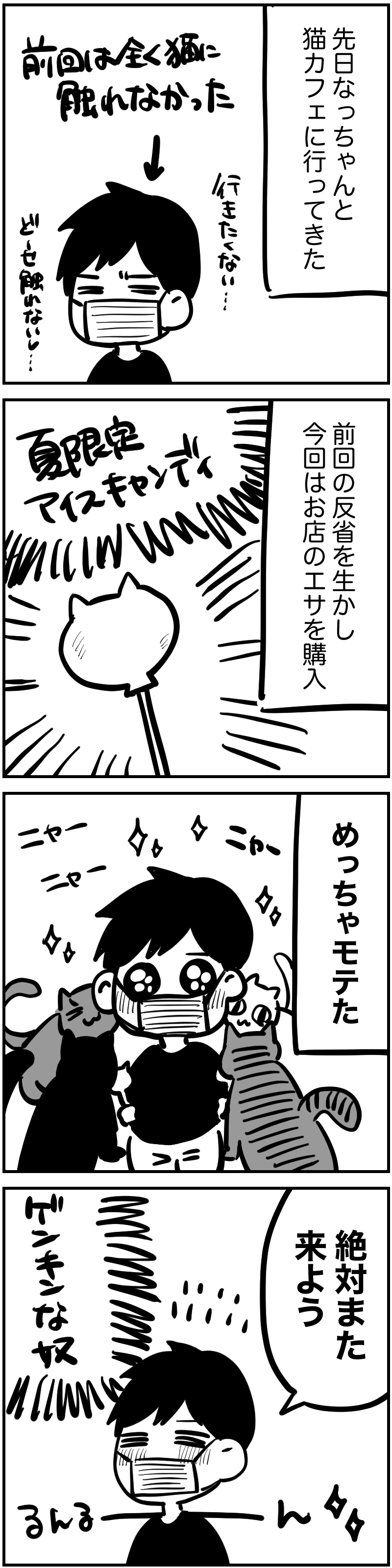 前回行った時は猫ちゃんに全然触れなくて、すごく可哀想ななっちゃんでしたが、今回のおやつ効果でかなり大満足のご様子でした。ご飯が好きなのは猫も人間も変わらないね。